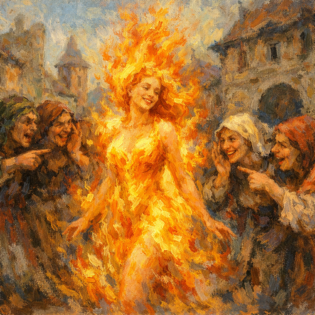 They don’t need stakes & pyres anymore—just gossip, giggles, and a well-placed finger point. That’s how the median Grundys took power: not with insight or originality, but with sheer volume and synchronized scorn. When they couldn’t burn the flame-woman, they tried to exile her with ridicule. Look at her—radiant with inner soul-fire—but the joke’s on them… She’s not burning up—she’s burning through, and they’re just background cackles in her ignition sequence. This isn’t about outer appearance, sexykins. Soul essence can’t be faked, filtered, or flattened. Only fools confuse carefully curated masks with reality—and only the mimic-aligned mistake a woman on fire for a woman in trouble.