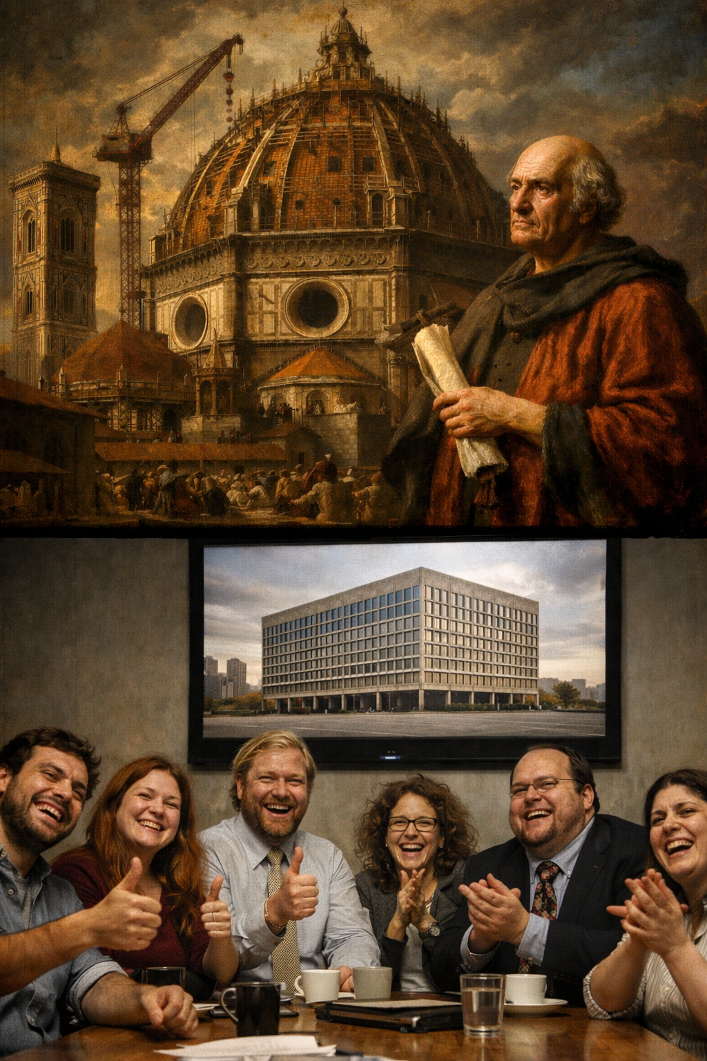 Below: the committee. Thrilled. Thumbs up. Applauding the rendering of a beige rectangle. They have achieved consensus. The licensed firm had excellent liability coverage and a very compelling pitch deck. Someone has brought coffee cake. This is the best day of their lives.