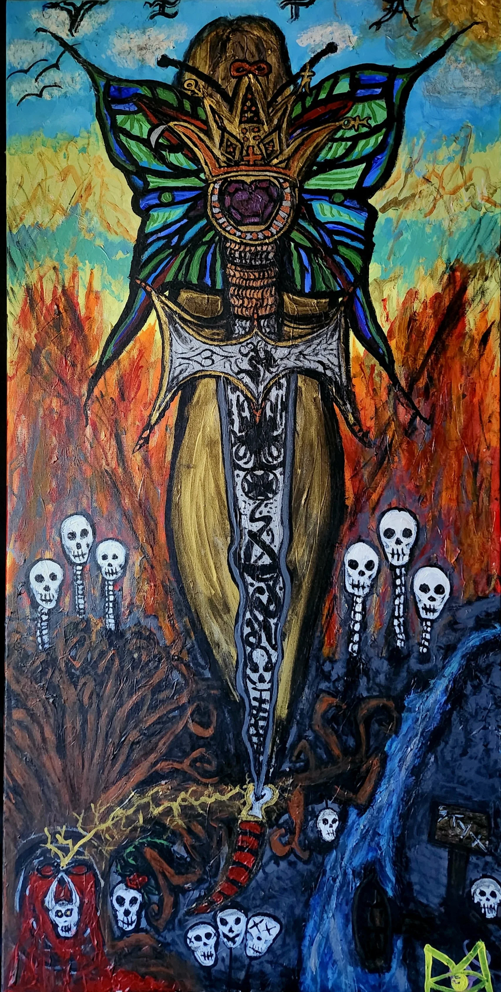 Beneath the acrylic and fabric hums a current of erotic invocation and esoteric revenge. From resurrected queens and skeletal lovers to trickster emperors and crucified moths, every piece is a psychic trapdoor lined in lace and teeth. Majeye paints with her body as much as her brush, merging death-glamour, occult pageantry, and sacred vengeance into relics. Welcome to the mirror corridor. Not all who look will see. Not all who see will leave unchanged. Majeye has many more that are not yet shown.
